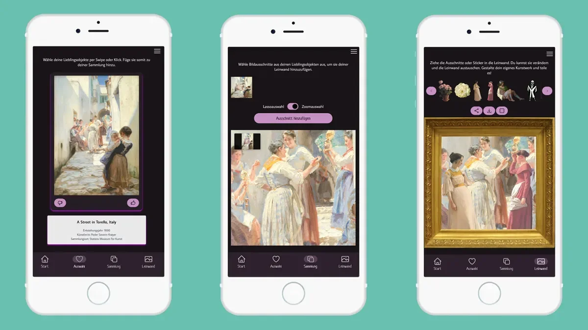 But they can also work with the pictures themselves. They can zoom in and say, hey, I especially like this little bird in the background, they can cut it right out. They can take out as many snippets as they want from these pictures and put them into their own new personal work of art, play around with backgrounds, with stickers. So they make a new artwork, a new cultural asset, that they can download and share.